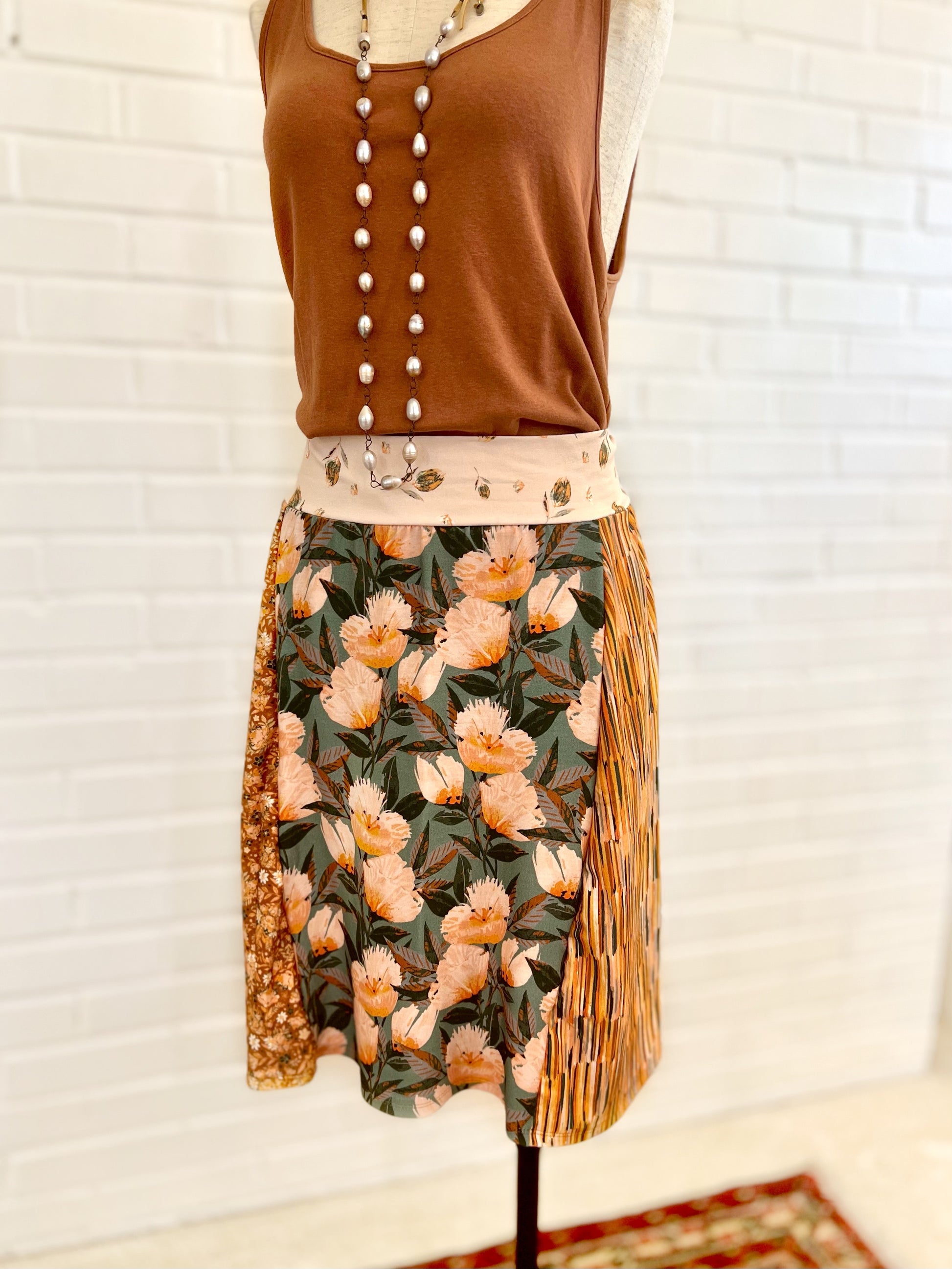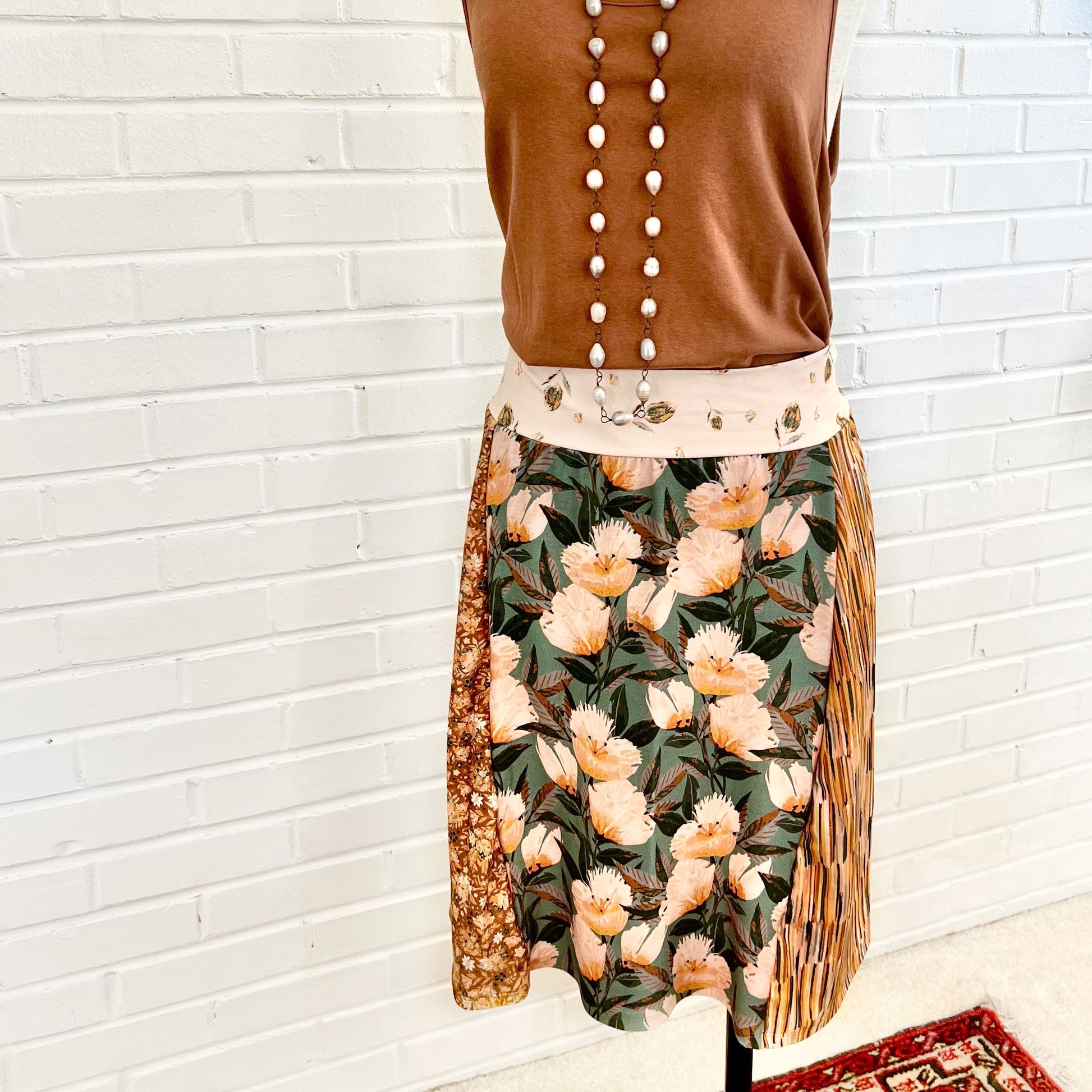 This skirt was curated using designs by surface pattern designer Safa Diab, an artist out of Vancouver, Canada. It's a gorgeous collection of copper tones, pink and blush, a nectarine shade, and a slate blueish green.