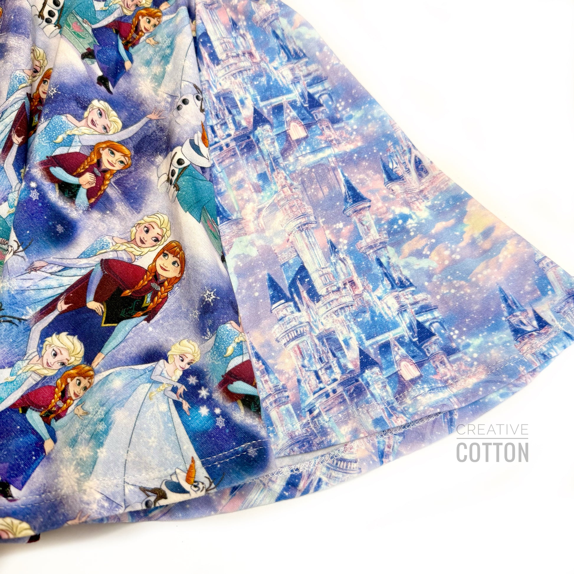 Baby / toddler / youth twirl skirt, sewn in our North Carolina studio. Fabric artwork is drawn by an artist and digitally printed on this fabric. 100% cotton spandex.