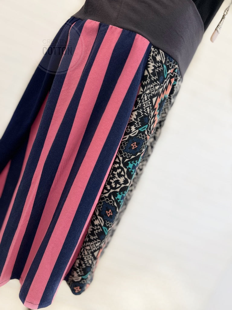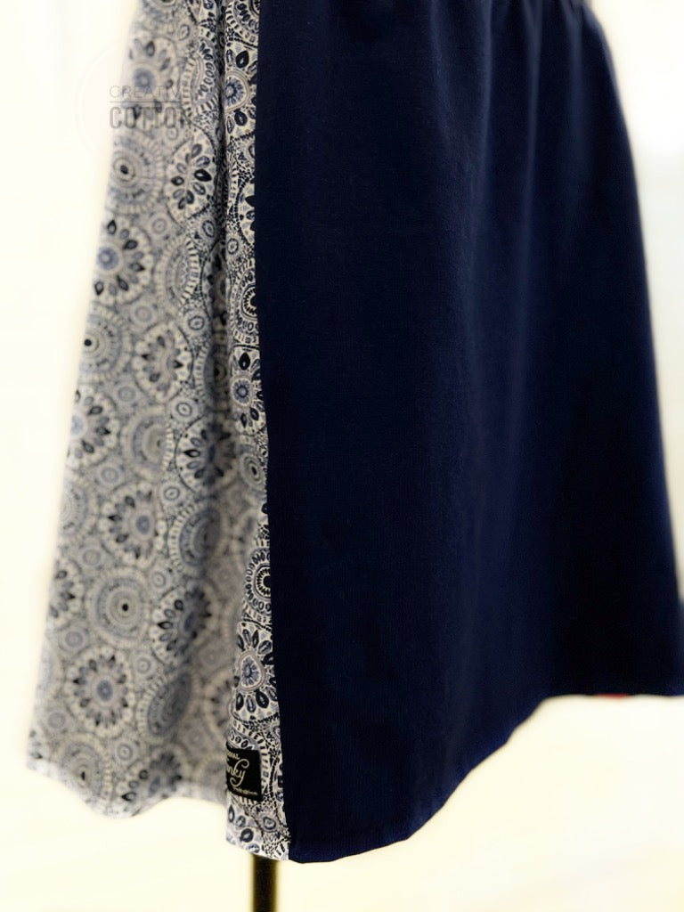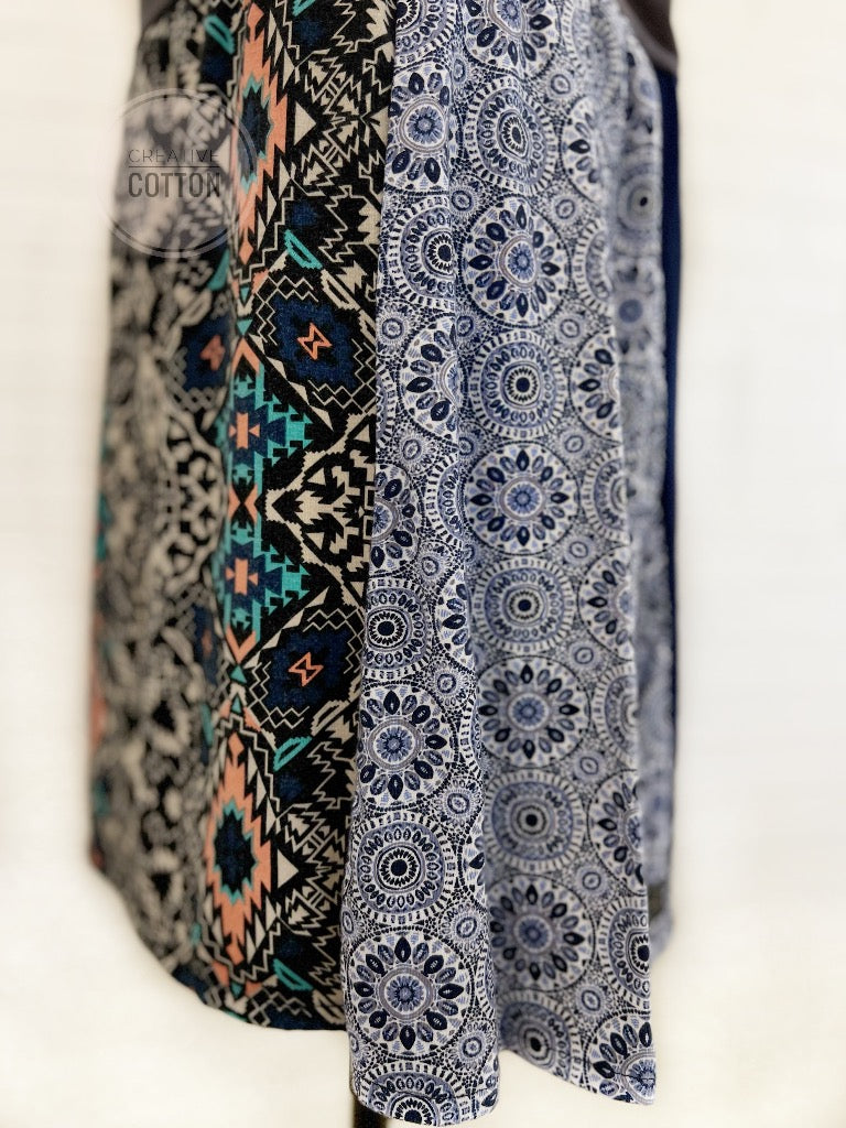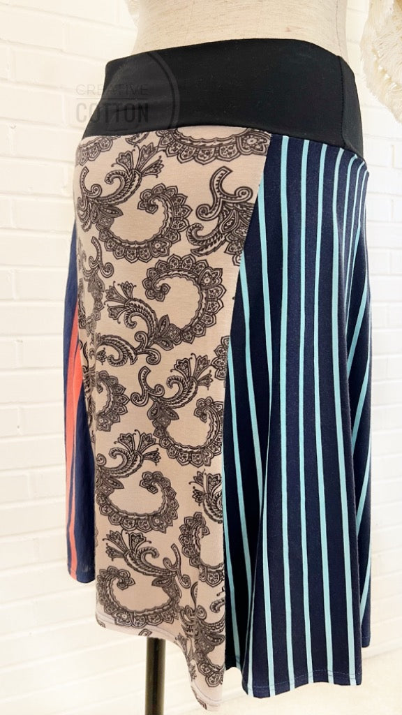 This skirt is constructed in our Market Skirt style with our trademark (zero bulk) yoga waist. The featured print is a renewable rayon spandex, super soft, fabulous drape, and excellent stretch.