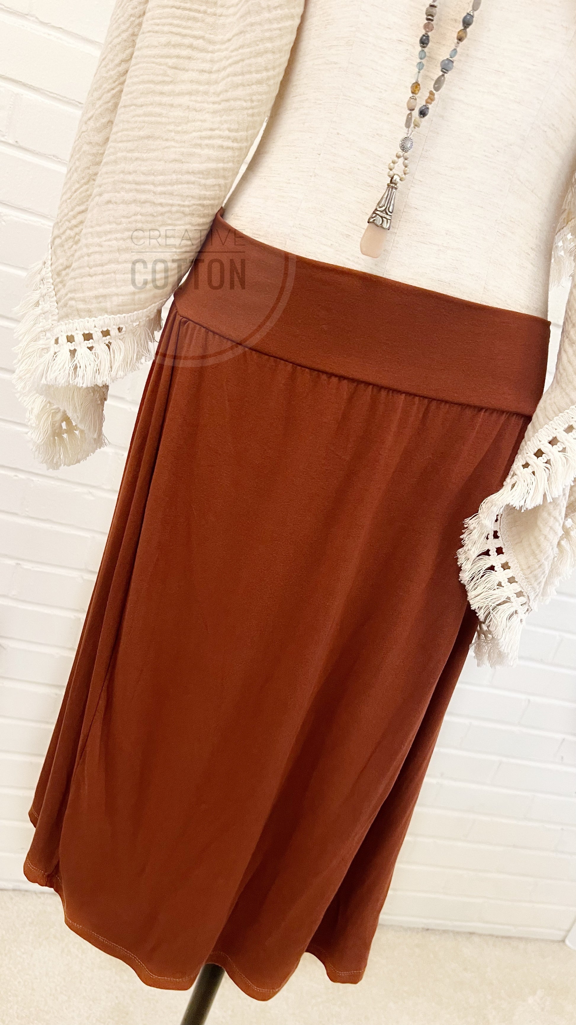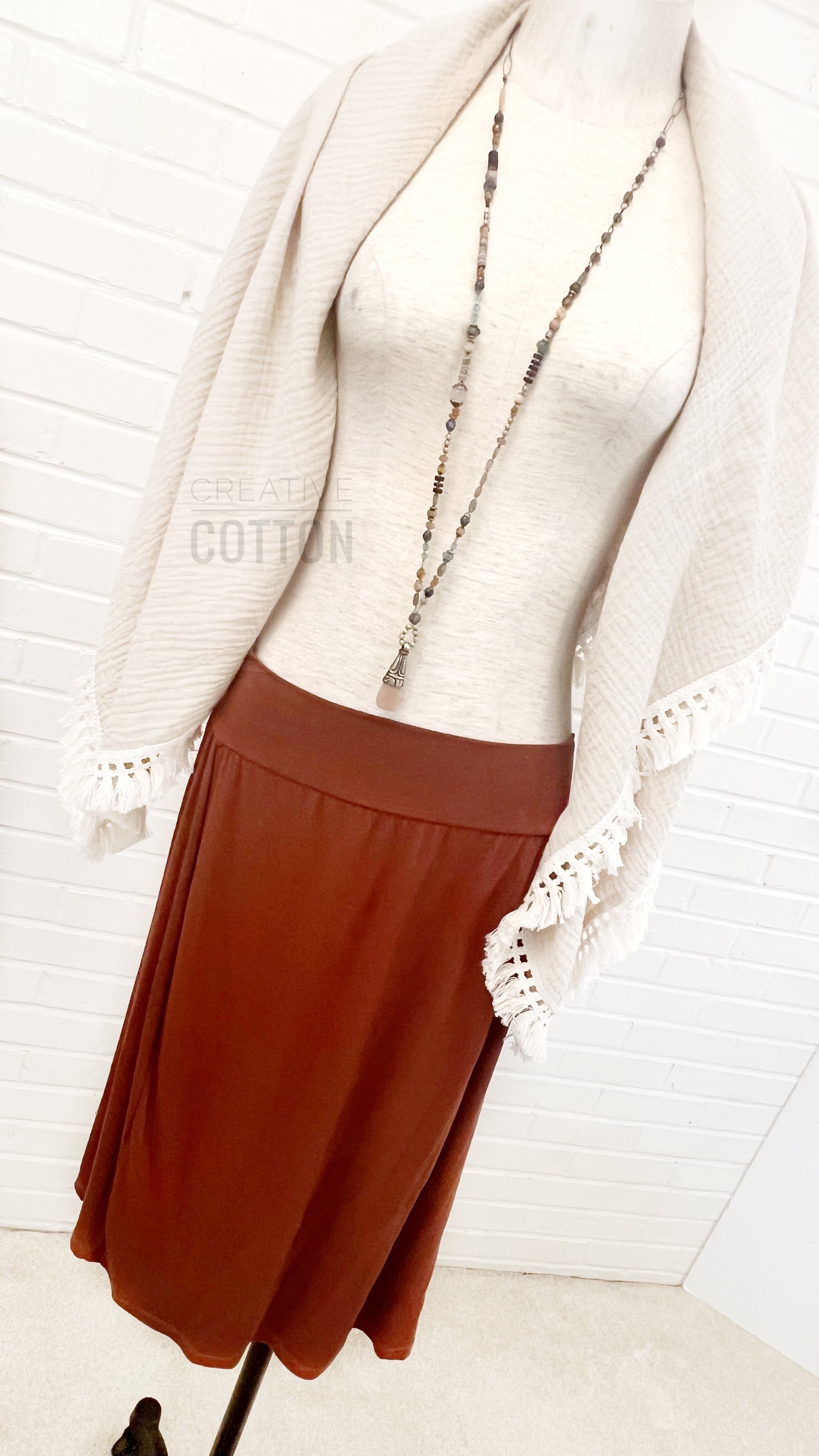 Style: This skirt is made of a scrumptious renewable rayon that has a very fluid drape without being clingy. Your curves fill this traditional a-line in all the right places, to show off a feminine little kick at the bottom. Designed to sit high-hip and fall right at the knee. Super-stretchy waistband.