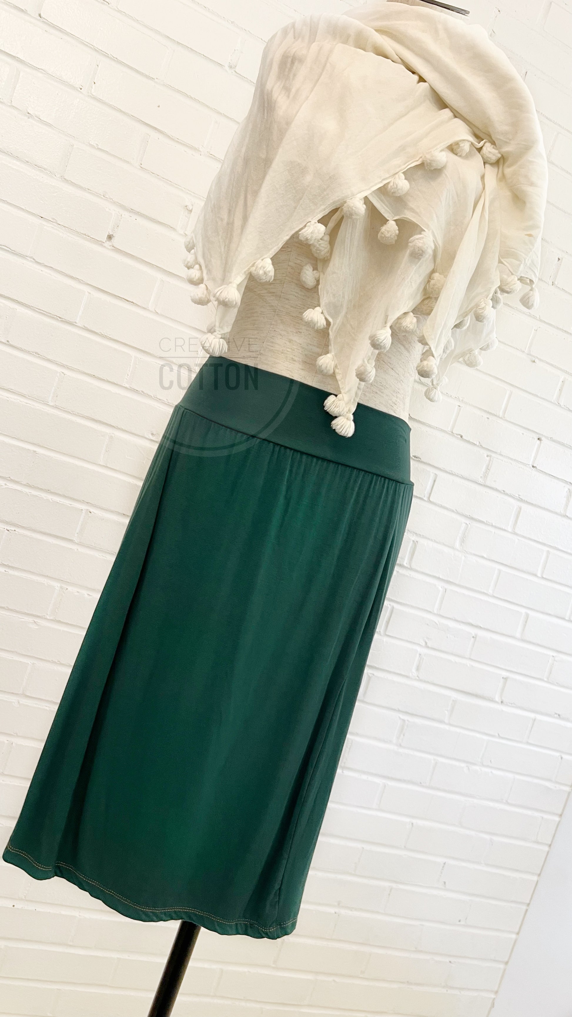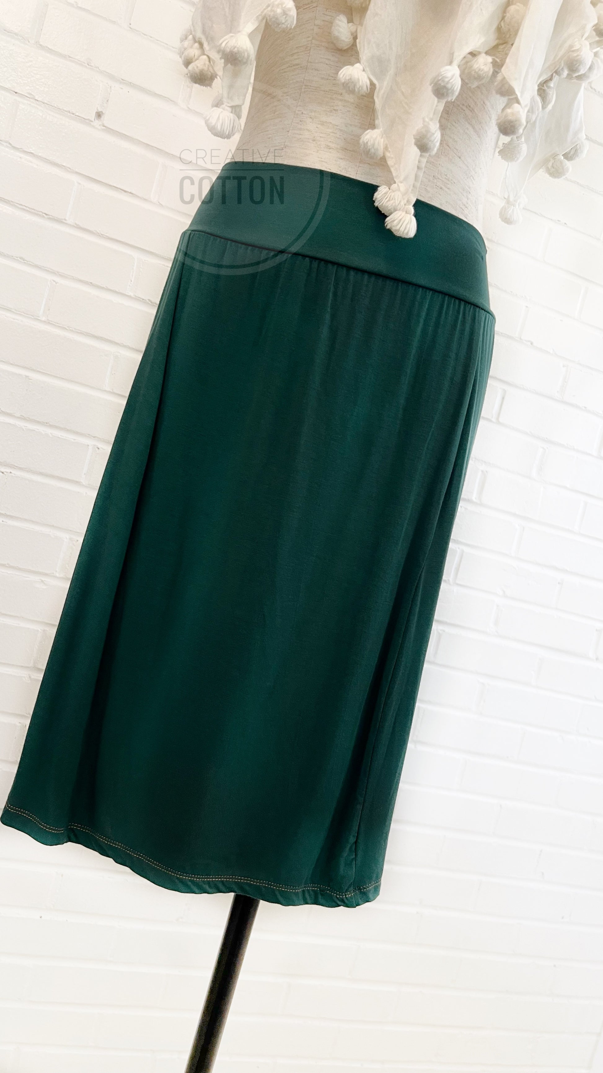 Style: This skirt is made of a scrumptious renewable rayon that has a very fluid drape without being clingy. Your curves fill this traditional a-line in all the right places, to show off a feminine little kick at the bottom. Designed to sit high-hip and fall right at the knee. Super-stretchy waistband.