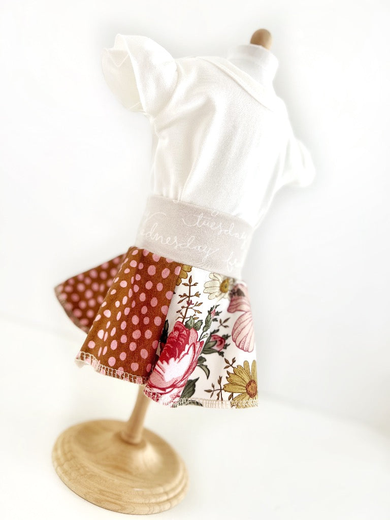 This is a doll skirt for her 18″ doll, such as American Girl dolls. You will NOT receive a doll, only this unique doll skirt. Matching girls skirt not available. Matching doll tees ARE available in the shop!